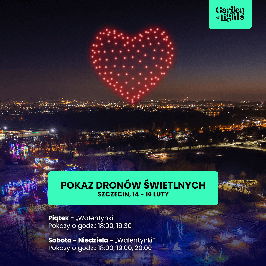 Pierwszy pokaz dronów świetlnych w Garden of Lights w Szczecinie! Wydarzenie, którego nie możecie przegapić - walentynkowe show, które stworzyliśmy specjalnie na to wyjątkowe święto zakochanych. Już 14, 15 i 16 lutego niebo nad Szczecinem po raz pierwszy rozbłyśnie dzięki setkom dronów świetlnych, które opowiedzą miłosną historię w niezapomniany, romantyczny sposób. Przygotujcie się na 12 zapierających dech w piersiach scen 3D, w których zobaczycie wiele pięknych symboli miłości. Poczujcie magię. Zatrzymajcie chwilę. Stwórzcie nowe, wyjątkowe wspomnienia. Zobaczcie, jak wyglądał pokaz dronów świetlnych w Mikołowie o tematyce “Piotruś Pan”: